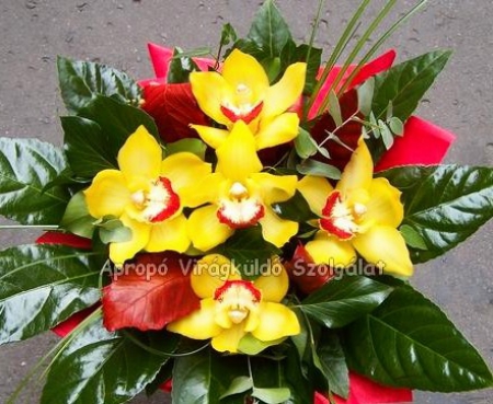 5 fej sárga orchideából készült csokor. A feltüntetett ár tartalmazza: a díszítést, az üdvözlőkártyát és a házhoz szállítás díját Debrecen területén! (Házhoz szállítást Hajdú-Bihar vármegye egész területén vállalunk!) Rendelését telefonon is leadhatja! - Apropó Virágbolt Debrecen