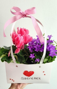 Leírás: Cikláment és campanulát tettünk egy aranyos "SZERETLEK" feliratú papírtáskába. (rendelkezésünkre álló színben szállítjuk) A feltüntetett ár tartalmazza: a növényeket, a papírtáskát, az üdvözlőkártyát, a díszítést és a házhoz szállítás díját Debrecen területén!